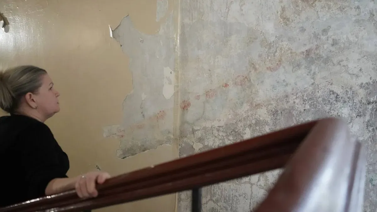 Парадная встречает полумраком. Полы чисто выметены, но ремонта явно не было давно. Между входом и первым этажом расчищен от нескольких слоёв краски фрагмент стены — это как раз над ней в своё свободное время трудятся волонтёры. Работа кропотливая, идёт небыстро, да и площадь, где могут разместиться люди, невелика — в среднем, одновременно задействованы четыре-пять человек.
