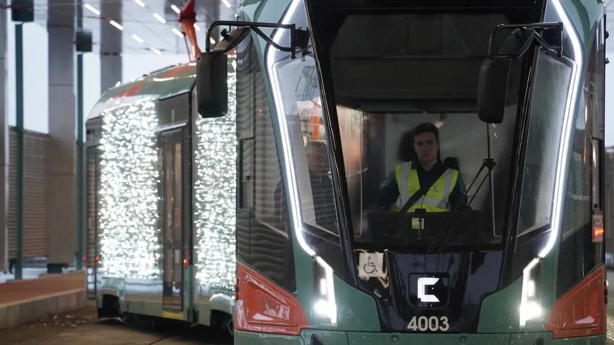 Платформа с голубым асфальтом за автобусным «бубликом» на Балканской площади притягивать людей начала в половину десятого утра. Уже через полчаса на перроне толпятся чёрные куртки с телевизионными камерами и фотоаппаратами — с одной стороны, и люди в касках и рабочей одежде — с другой. Всё понятно — сегодня здесь ждут первый бирюзово-оранжевый трамвай с пассажирами внутри.