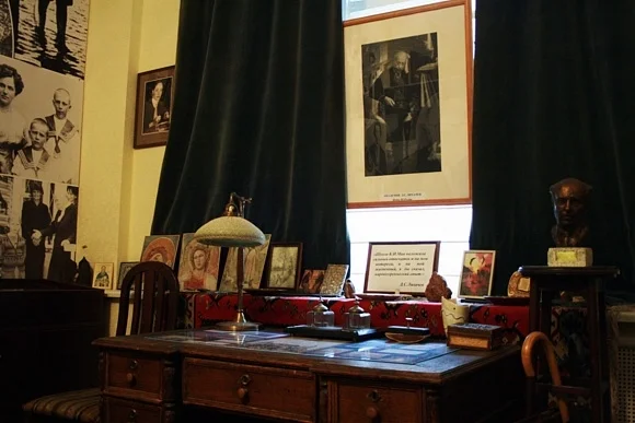 В музее всего два зала. В одном из них экспозиция, посвященная академику Лихачеву и представителям семьи Рерих, учившимся в школе Карла Мая. Один из главных экспонатов - рабочий стол академика, под стеклом на столешнице даже сохранились стихотворные строки, записанные им.