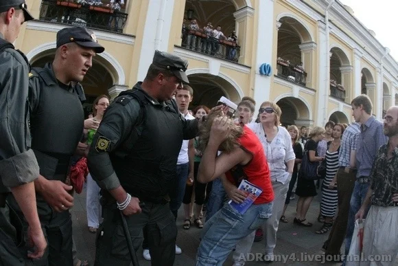 Напомним, у Гостиного Двора проходила несанкционированная акция в защиту 31-й статьи Конституции РФ, гарантирующей гражданам право на свободу собраний. Задержания проводились без нежностей, но в целом милиционеры держали себя в руках. Тем ярче на фоне коллег выделился один ретивый прапорщик.