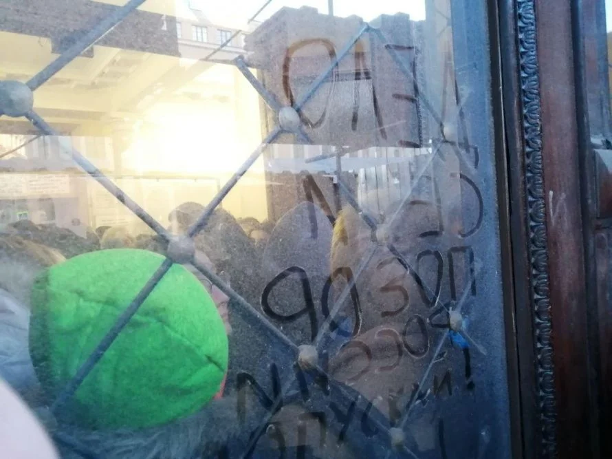 Судебные приставы утверждают, что судьи не смогут пройти. Часть людей пытается попасть в суд, часть выходит в пикеты, некоторые выводят пальцами на пыльных стеклах «Дело „Сети“ — позор».