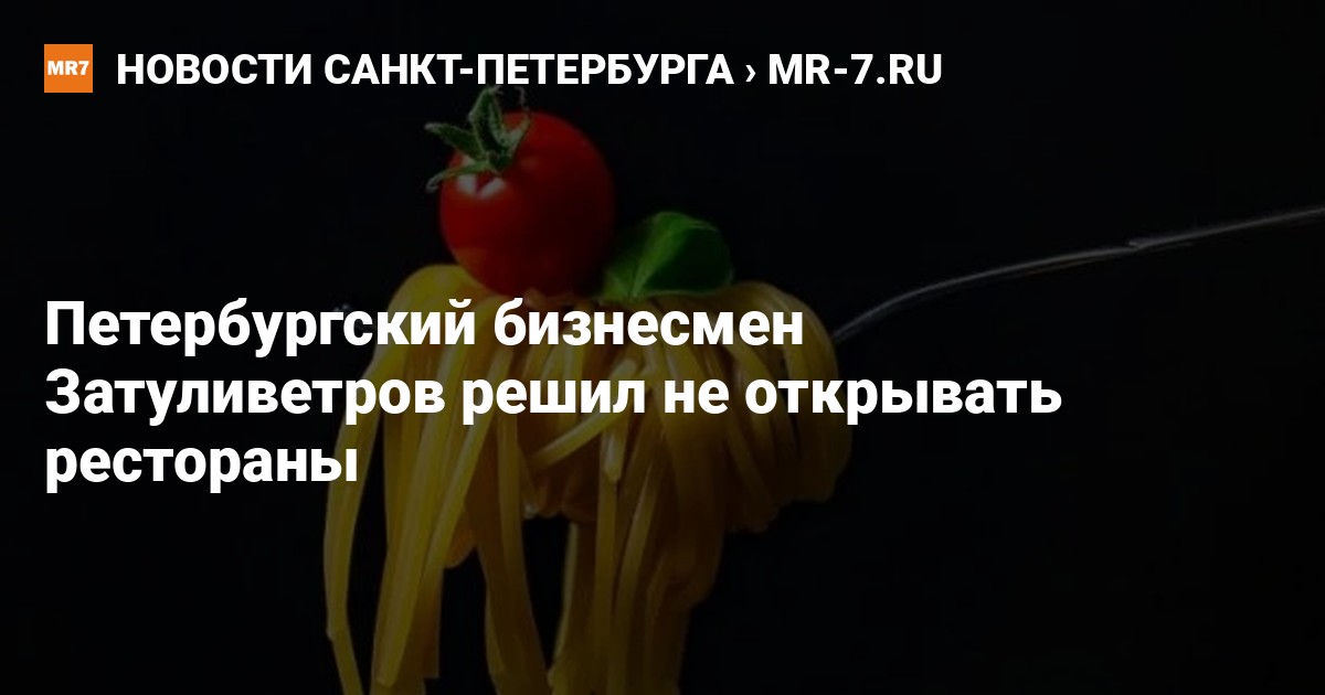 Петербургский бизнесмен Александр Затуливетров передумал открывать рестораны 15 апреля. Об этом 14 апреля сообщает «Северо-Запад. МБХ медиа» со ссылкой на предпринимателя.