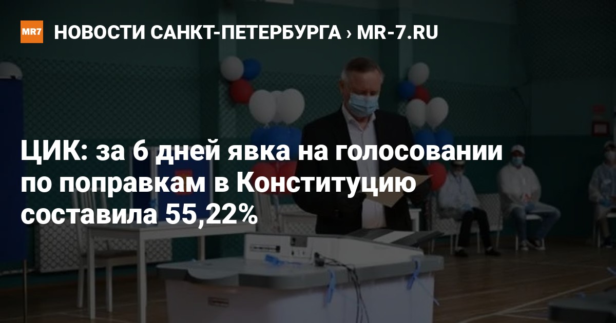 По данным Центризбиркома РФ, явка на голосовании по поправкам в Конституцию в России за шесть дней составила 55,22%.