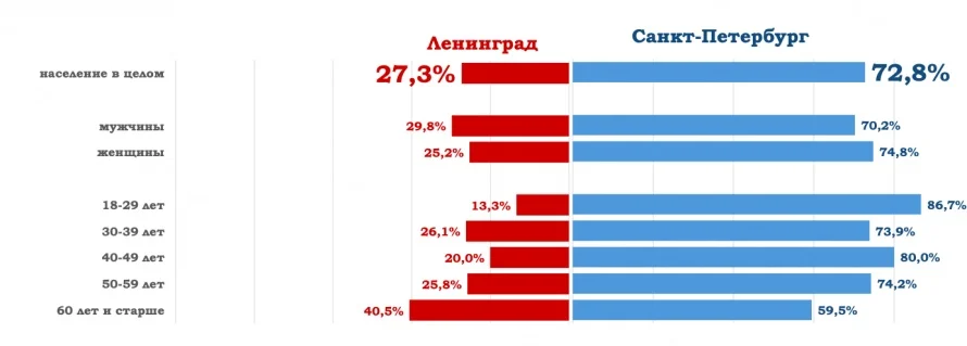 При этом лишь 25,8% горожан в возрасте 50−59 лет проголосовали за Ленинград, а 74,2 — за Санкт-Петербург.