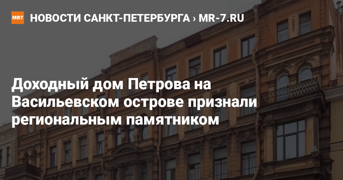Доходный дом Степана Петрова на 9-й линии Васильевского острова признали памятником регионального значения. Соответствующее распоряжение подписал глава комитета по государственному контролю, использованию и охране памятников (КГИОП) Сергей Макаров.