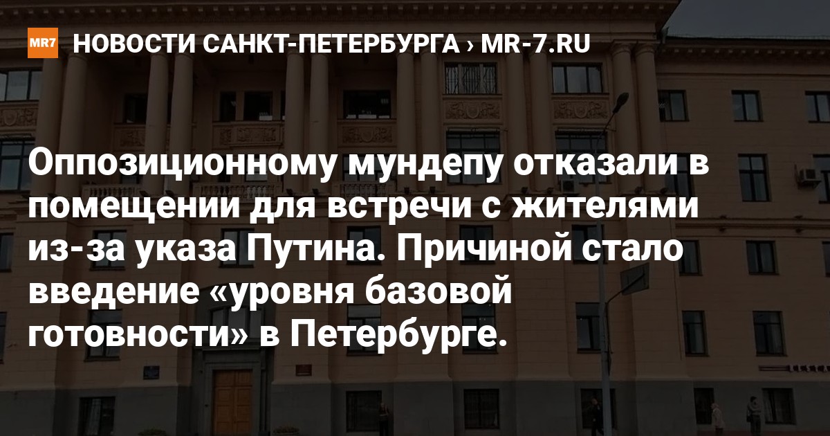Муниципальному депутату МО «Гражданка» Вадиму Сафонову отказали в помещении для встречи с жителями. Администрация Калининского района Петербурга объяснила это указом президента Владимира Путина и введением «уровня базовой готовности» в городе.
