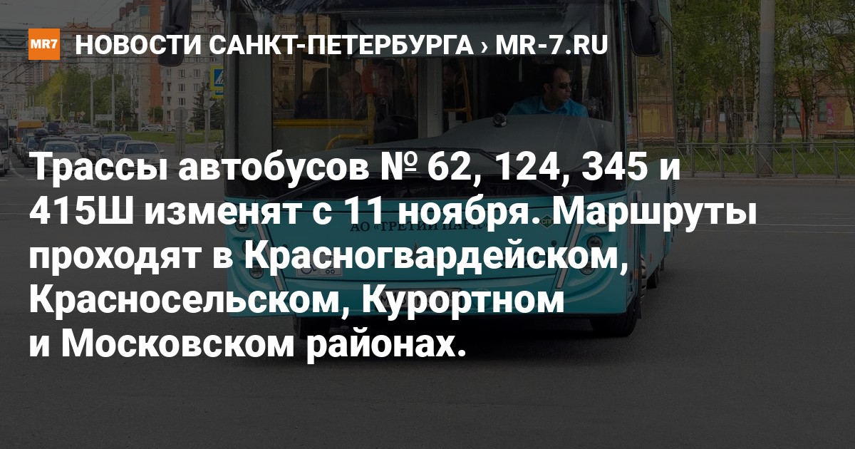 В Петербурге с 11 ноября для улучшения транспортного обслуживания изменят трассы автобусов № 62, 124, 345 и 415Ш, сообщают в пресс-службе комитета по транспорту.