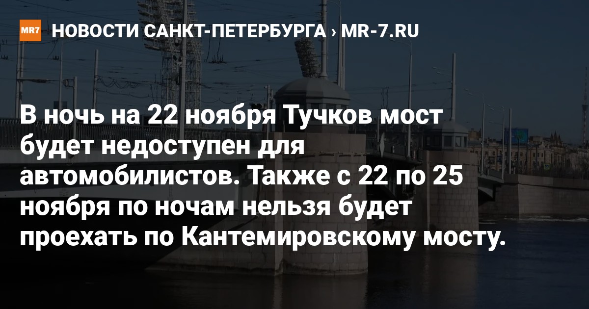 Кроме того, с 22 по 25 ноября из-за технических работ движение автомобилей по Кантемировском мосту будут перекрывать в интервале с 1:30 до 04:30. Другие мосты разведут по графику.