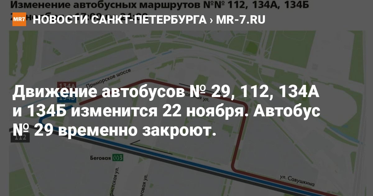 Автобусы № 112, 134А, 134Б с 17:00 до 24:00 проследуют по улице Савушкина, без заезда на Яхтенную улицу и Приморский проспект. Движение автобуса № 29 с 17:00 до 21:30 будет закрыто.