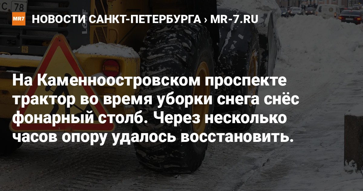 Инцидент произошёл утром 15 декабря на Каменноостровском проспекте у Австрийской площади. Снегоуборщик зацепил новогоднее украшение, которое потянуло за собой фонарь.
