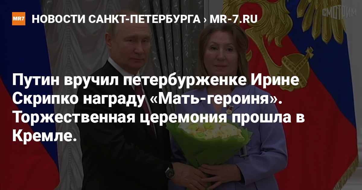 Президент России Владимир Путин вручил награду «Мать-героиня» жительнице Петербурга Ирине Скрипко. Мероприятие состоялось 20 декабря в Екатерининском зале первого корпуса Кремля.
