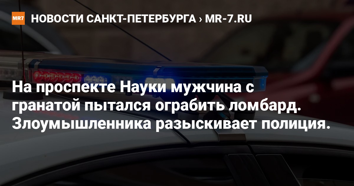 Служба безопасности сети ломбардов в Петербурге обратилась в полицию вечером 28 декабря. Сотрудник сообщил, что около 20:45 в помещение ломбарда на проспекте Науки вошёл неизвестный и начал угрожать 30-летней продавщице. В руках у него был предмет, похожий на гранату. Он потребовал, чтобы женщина отдала ему деньги и драгоценности, но та отказалась. После этого злоумышленник скрылся.