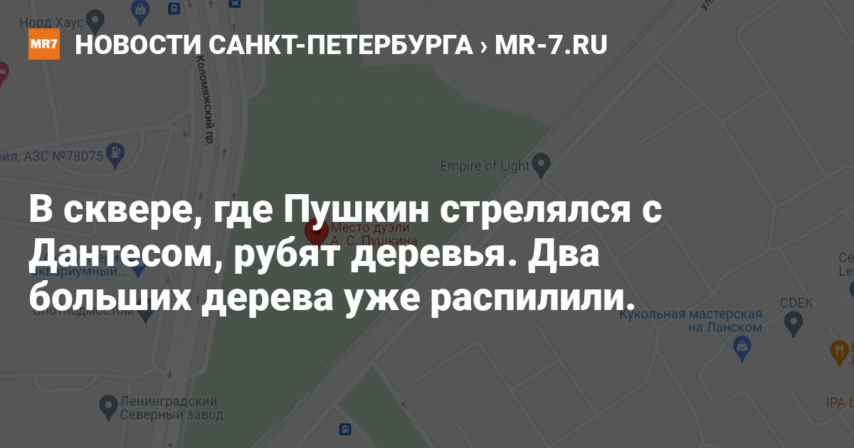 В сквере на Коломяжском проспекте, где стрелялись Александр Пушкин и Жорж Шаль Дантес, продолжается вырубка деревьев. О дуэли чиновников с зелеными насаждениями рассказали 29 декабря местные жители в чате Приморского района.
