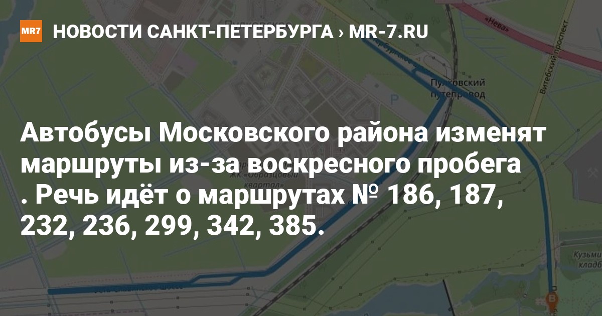 Автобусы № 186, 187, 232, 236, 299, 342 и 385 изменят свои маршруты утром 22 января из-за легкоатлетического пробега «Пулково — Пушкин». Ограничения будут действовать с 8:30 до 12:30, сообщает «Организатор перевозок».