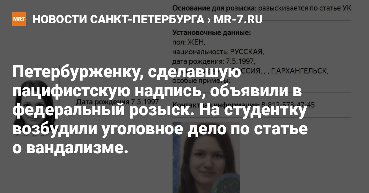 Студентку из Петербурга Марину Сергееву, которая покинула Россию из-за уголовного преследования, объявили в федеральный розыск, сообщает Telegram-канал Sota со ссылкой на саму петербурженку.