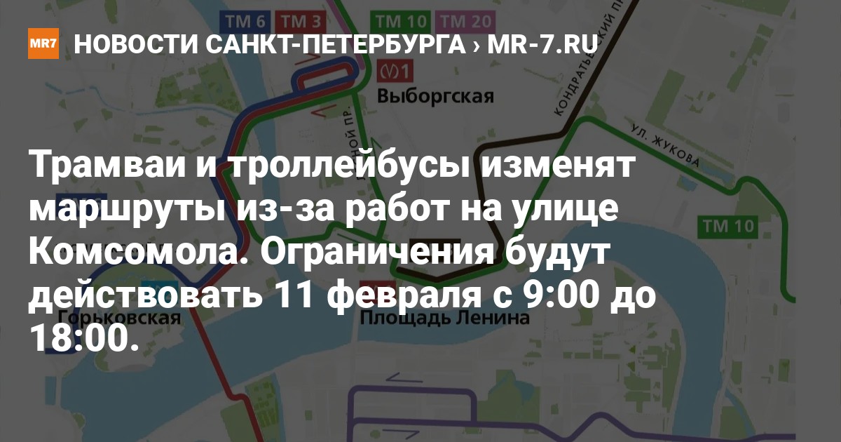 В субботу, 11 февраля, маршруты трамваев № 3, 6, 10 и 20 и троллейбусов № 3 и 8 изменят движение с 9:00 до 18:00 из-за работ на перекрёстке улицы Академика Лебедева и улицы Комсомола, сообщили в пресс-службе «Организатора перевозок».