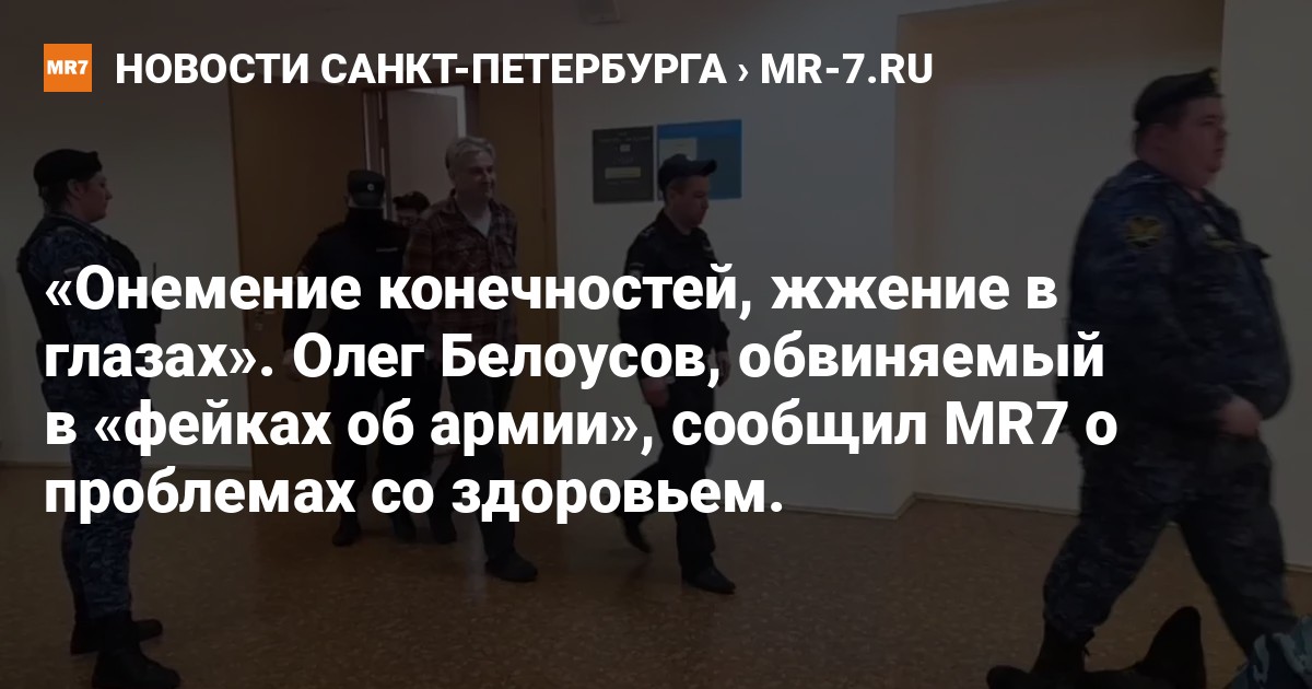 Обвиняемый в «фейках об армии» петербургский поисковик Олег Белоусов сообщил MR7 об онемении конечностей и жжении в глазах. Он рассказал об этом в письме из СИЗО, отправленном накануне суда 14 февраля. Кроме этого, он подчеркнул, что не согласен со всеми обвинениями по своему делу.