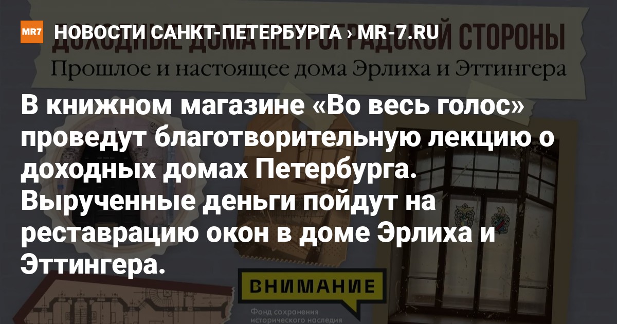 В следующую пятницу, 24 марта, в книжном магазине «Во весь голос» в Петербурге состоится благотворительная лекция в пользу доходного дома Эрлиха и Эттингера. Об этом рассказали в Telegram-канале фонда «Внимание», занимающегося реставрацией здания.