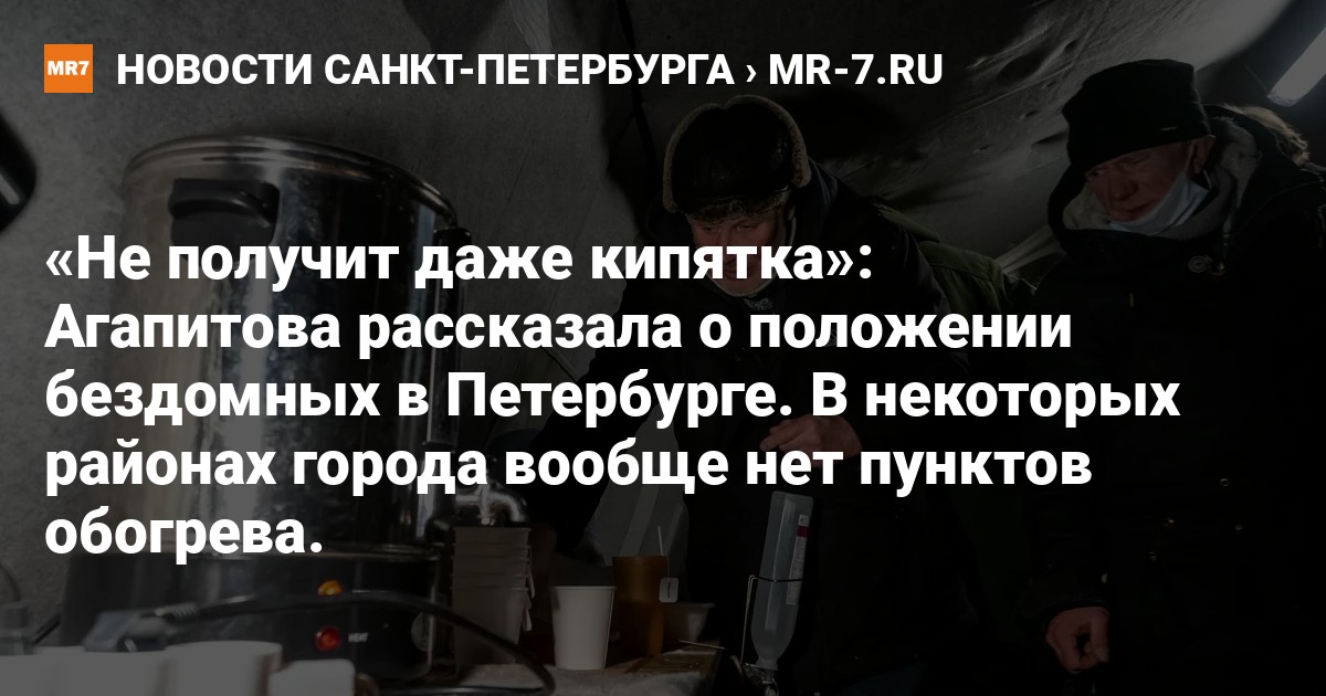 По словам Агапитовой, в Курортном и Колпинском районах вообще нет пунктов обогрева для бездомных, а в тех районах, где такие места есть, бездомные не всегда могут переночевать. Например, Петроградском районе человек без места жительства «не получит даже кипятка», только стул.