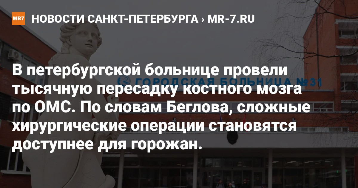 В городской больнице № 31 на Крестовском острове провели тысячную операцию по пересадке костного мозга. Трансплантацию сделали по полису ОМС, сообщили в пресс-службе Смольного.