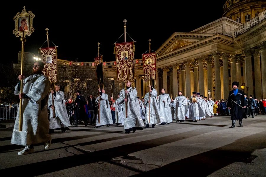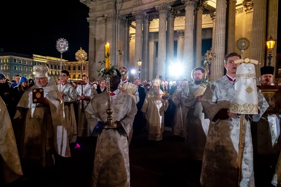 Сегодня, 16 апреля, православные жители Петербурга отмечают Пасху. Традиционное праздничное богослужение и крестный ход прошли в Казанском кафедральном соборе. Богослужение совершил митрополит Санкт-Петербургский и Ладожский Варсонофий.