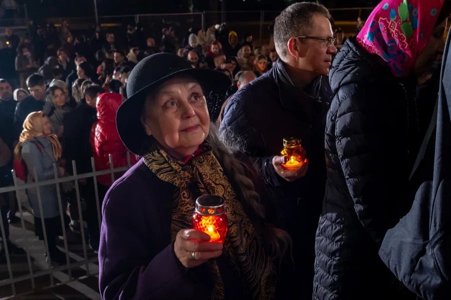 Благодатный огонь из Иерусалима доставили в Казанский собор около половины пятого утра. Священнослужители поделились частичкой главного символа Пасхи со всеми прихожанами.
