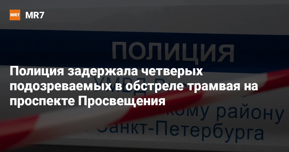В Выборгском районе Петербурга полицейские задержали четверых человек, которых подозревают в обстреле трамвая вечером 21 апреля на пересечении проспекта Просвещения и улицы Руднева. Возбуждено уголовное дело по статье о хулиганстве (213 УК РФ).