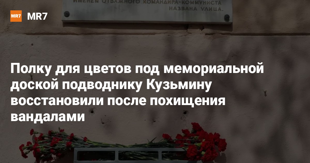 Полку для цветов под мемориальной доской подводнику Герою Советского Союза Павлу Кузьмину, ранее похищенную вандалами, восстановили к 9 Мая в Кировском районе Петербурга, сообщает пресс-служба депутата ЗакСобрания Алексея Цивилёва.
