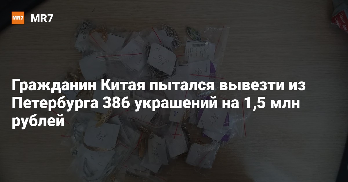 Мужчина зарегистрировался на рейс Петербург — Чэнду, а ювелирные изделия сдал в багаж. Во время проверки сотрудники таможни обнаружили в чемодане иностранца 386 новых украшений из золота и серебра со вставками из фианита, бриллианта, опала, агата, топаза и других драгоценных камней. Их общую стоимость оценили в 1,5 миллиона рублей.