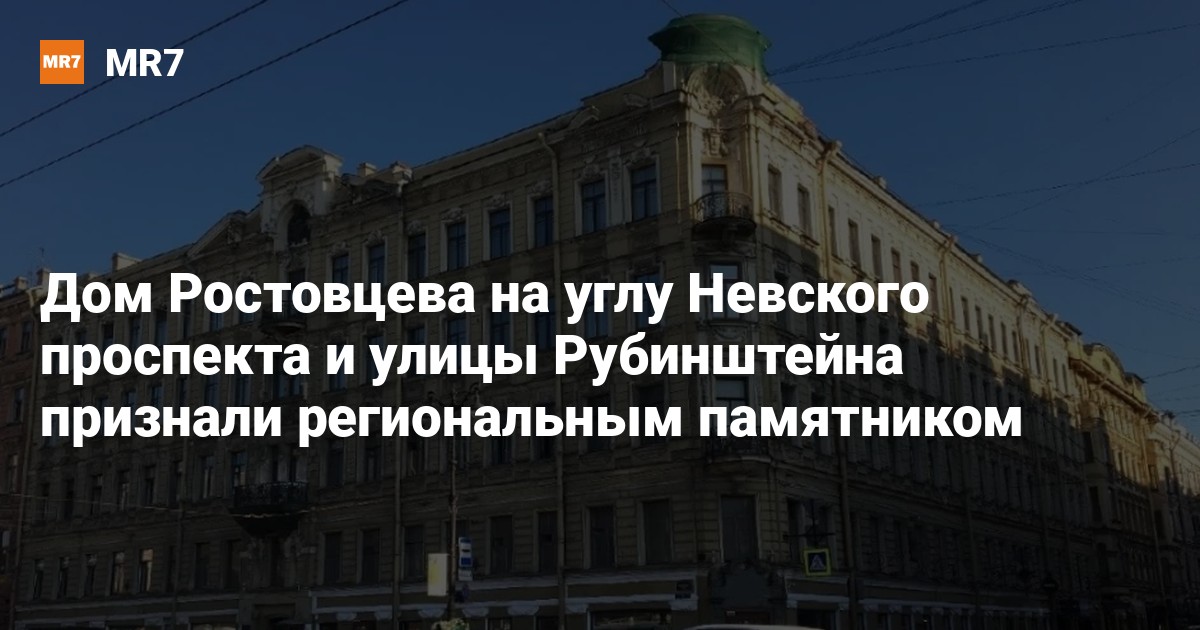 Доходный дом генерал-майора Ильи Ростовцева на пересечении Невского проспекта и улицы Рубинштейна внесли в единый реестр объектов культурного наследия регионального значения, сообщили в пресс-службе КГИОП.