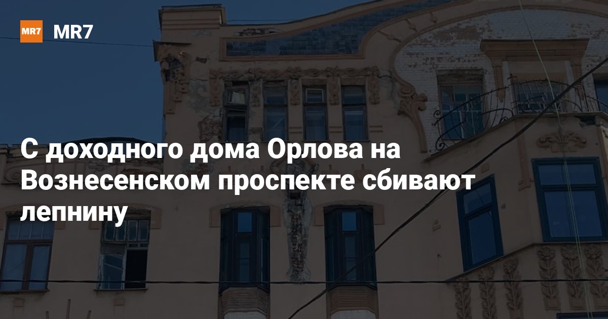 С фасада памятника архитектуры доходного дома Е.М. Орлова на Вознесенском проспекте, 18, сносят лепной декор, сообщили 7 июня в Telegram-канале «SOS СПб СНОС».