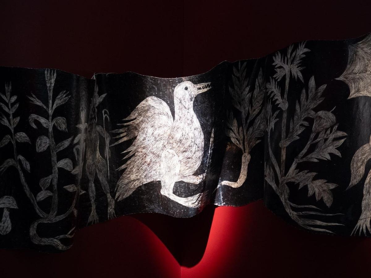 Стенд MYTH Gallery — галереи — лауреата премии «ТОП50. Самые знаменитые люди Петербурга» — 2023. В Манеж» выставлен 15-метровый «Большой исход» художника Вадима Михайлова. Работа приехала на ярмарку с его персональной выставки в пермском музее ПЕРММ. Фото: Дмитрий Абрамов / MR7