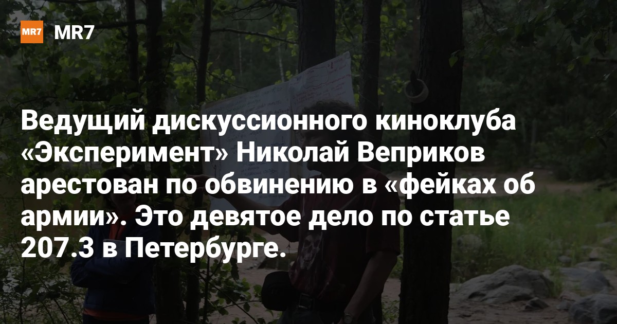 Новое дело по статье 207.3 УК РФ «о фейках об армии» заведено в Петербурге. Арестован и отправлен в СИЗО «Кресты» демократический активист, программист Николай Веприков. Его обвиняют в распространении ложных сведений в ВК и с помощью репостов YouTube-видео. Это уже девятое дело по этой уголовной статье в городе. Однако впервые дело заведено по первой части статьи, а не по второй. Максимальное наказание по ней — до пяти лет лишения свободы.