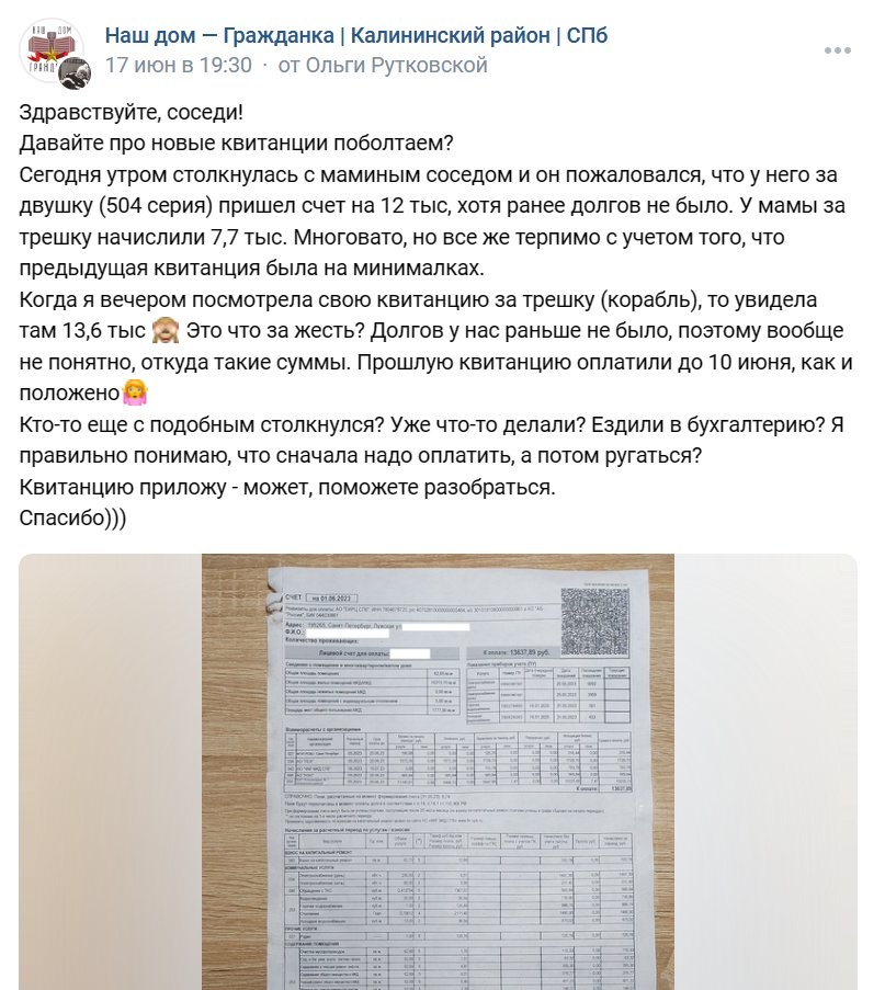 Так, в группе «Наш дом — Гражданка | Калининский район | СПб» во «ВКонтакте» местные жители жалуются на новые квитанции. По их словам, такие большие счета им никогда раньше не приходили.
