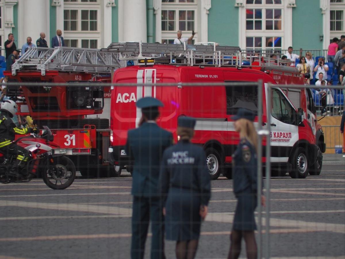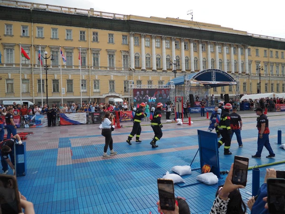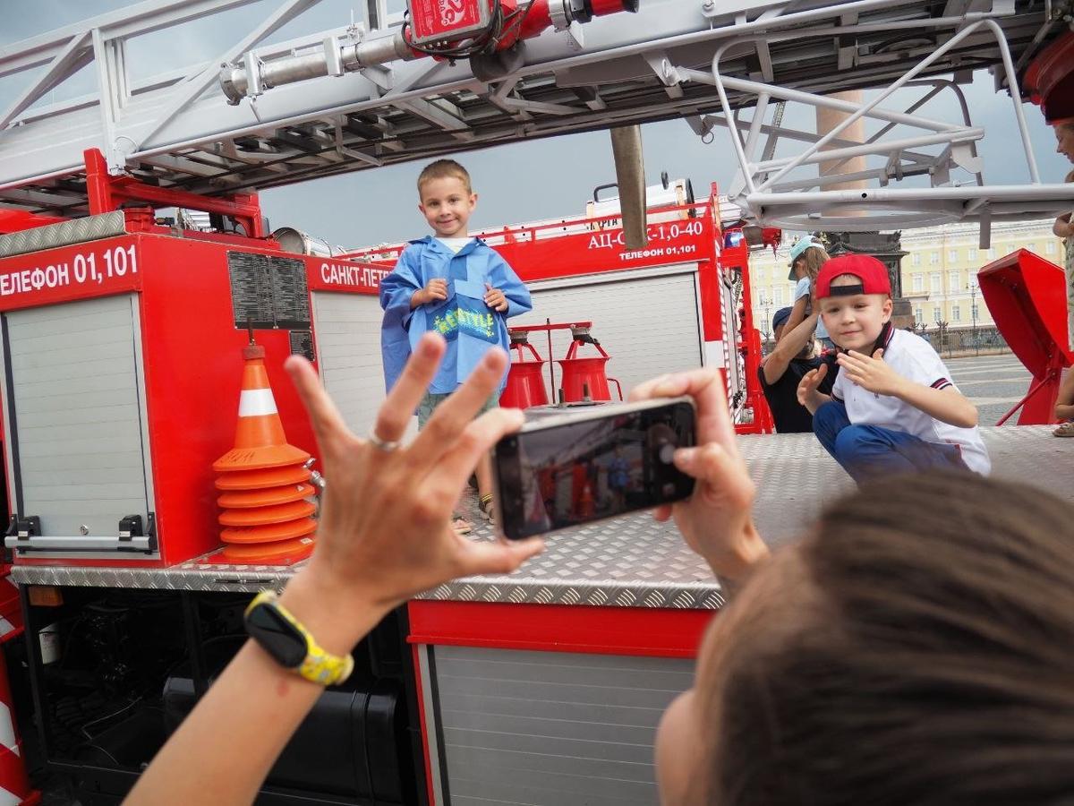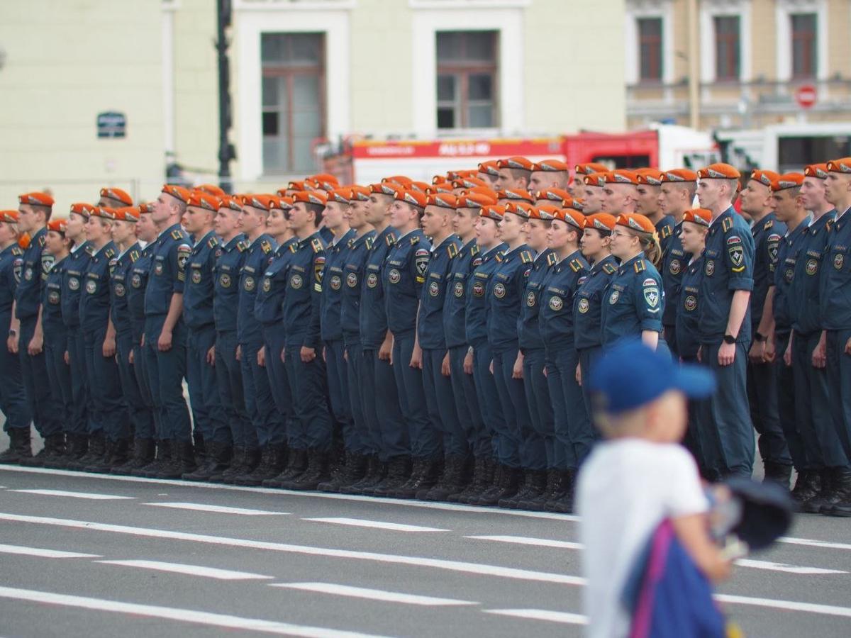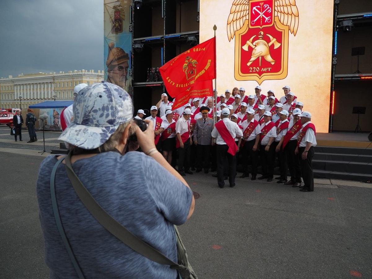 На Дворцовой площади показали старую и современную пожарно-спасательную технику. По брусчатке прошли расчёты пожарно-спасательных подразделений города, ветераны пожарной охраны и курсанты.