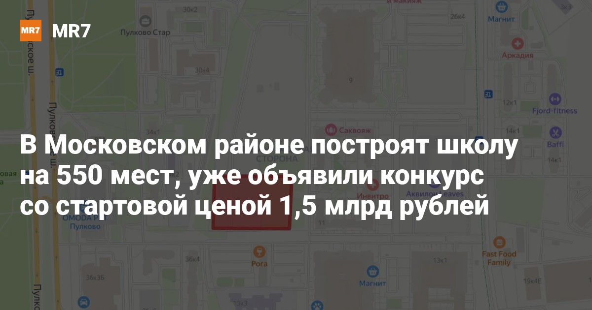 В Московском районе Петербурга объявили конкурс на строительство школы на территории, ограниченной Пулковским шоссе, Дунайским проспектом, Среднерогатской улицей и Южным полукольцом Октябрьской железной дороги. Как сообщает 6 июля RosTender.info, с победителем заключат договор на 1,5 миллиарда рублей.