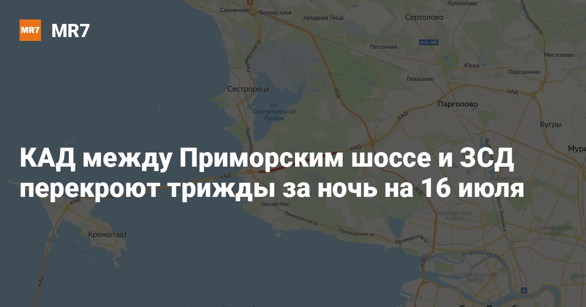 На участке Кольцевой автодороги (КАД) Петербурга между развязками с Приморским шоссе и Западным скоростным диаметром (ЗСД) полностью перекроют движение три раза за ночь с 15 на 16 июля.