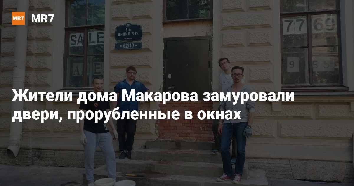 Жители дома Макарова на 5-й линии Васильевского острова, 62, вместе с градозащитниками замуровали дверные проёмы, прорубленные ранее собственником в окнах, сообщает 17 июля градозащитный пресс-центр.