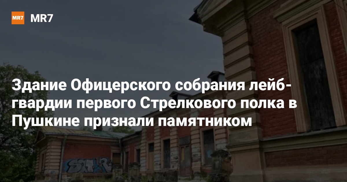 Здание Офицерского собрания лейб-гвардии первого Стрелкового полка в Пушкине включили в реестр памятников регионального значения, рассказали 18 июля в пресс-службе комитета по государственному контролю, использованию и охране памятников истории и культуры (КГИОП).