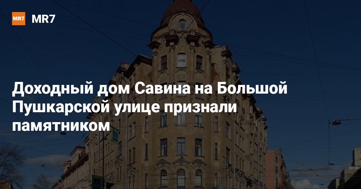 Комитет по охране памятников (КГИОП) признал объектом культурного наследия доходный дом Абрама Савина на углу Большой Пушкарской и Съезжинской улиц, сообщили в пресс-службе комитета.