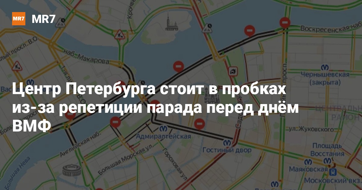В среду, 19 июля, в центре Петербурга образовалась пробка — там сегодня огранчили движение из-за репетиции военного-морского парада на День ВМФ.
