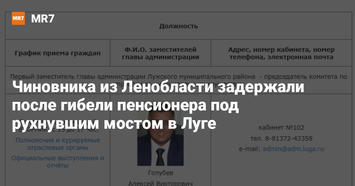 Согласно сайту администрации Лужского района, задержанным чиновником является Алексей Голубев, он же возглавляет комитет по управлению муниципальным имуществом. Голубева подозревают в причинении смерти по неосторожности (часть 2 статьи 109 УК РФ). Чиновника допросили и поместили в изолятор временного содержания до суда по мере пресечения. Следствие ходатайствует об избрании Голубеву ареста.