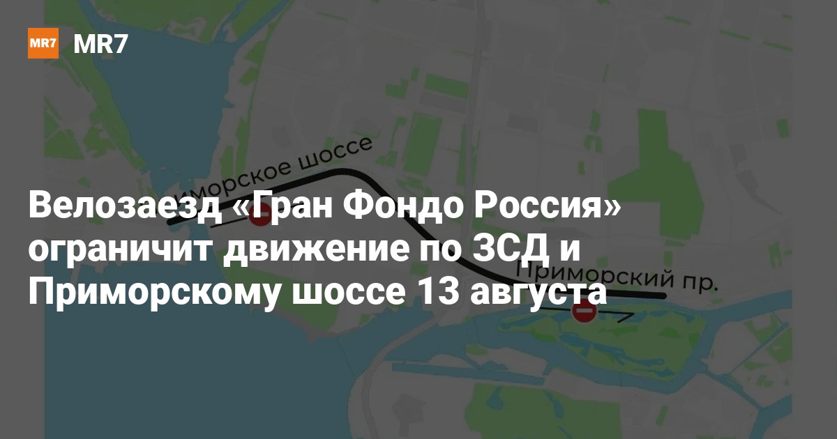 В Петербурге в воскресенье 13 августа пройдёт серия шоссейных велосипедных заездов — «Гран Фондо Россия». Из-за этого в городе перекроют Западный скоростной диаметр (ЗСД), Приморское шоссе и Приморский проспект, предупредили в городском комитете по транспорту.