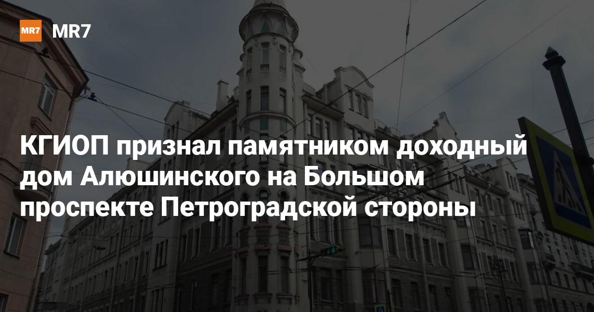 Комитет по охране памятников (КГИОП) признал объектом культурного наследия регионального значения бывший доходный дом председателя правления «Петроградского общества взаимного кредита» Ивана Алюшинского на Большом проспекте Петроградской стороны, сообщает пресс-служба комитета.