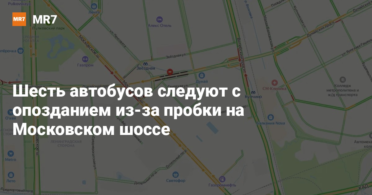 Из-за пробки на Московском шоссе увеличилось время в пути автобусов № 179, 192, 196, 197, 388, 521. Сначала задержки достигали 40 минут, но к 17:00 время дополнительного ожидания уменьшилось до 20 минут