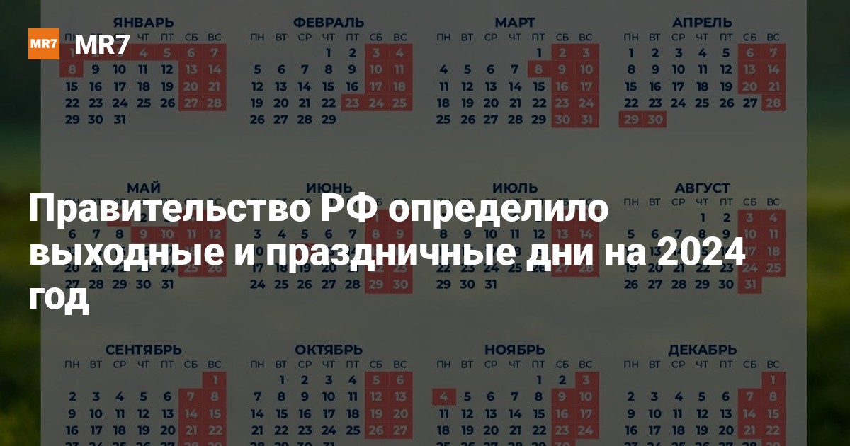 Правительство России определило выходные и праздничные дни на 2024 год. Соответствующее постановление подписал председатель правительства Михаил Мишустин.