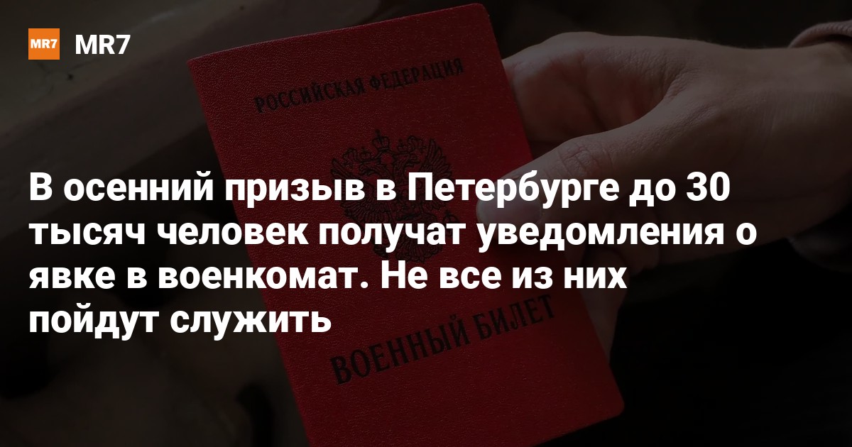 Уведомления о необходимости явиться в военкоматы в осенний призыв в этом году получат до 30 тысяч петербуржцев. Повестки впервые будут рассылать онлайн, через «Госуслуги», сообщил на заседании правительства Петербурга временно исполняющий обязанности военного комиссара города Марат Урмансов.