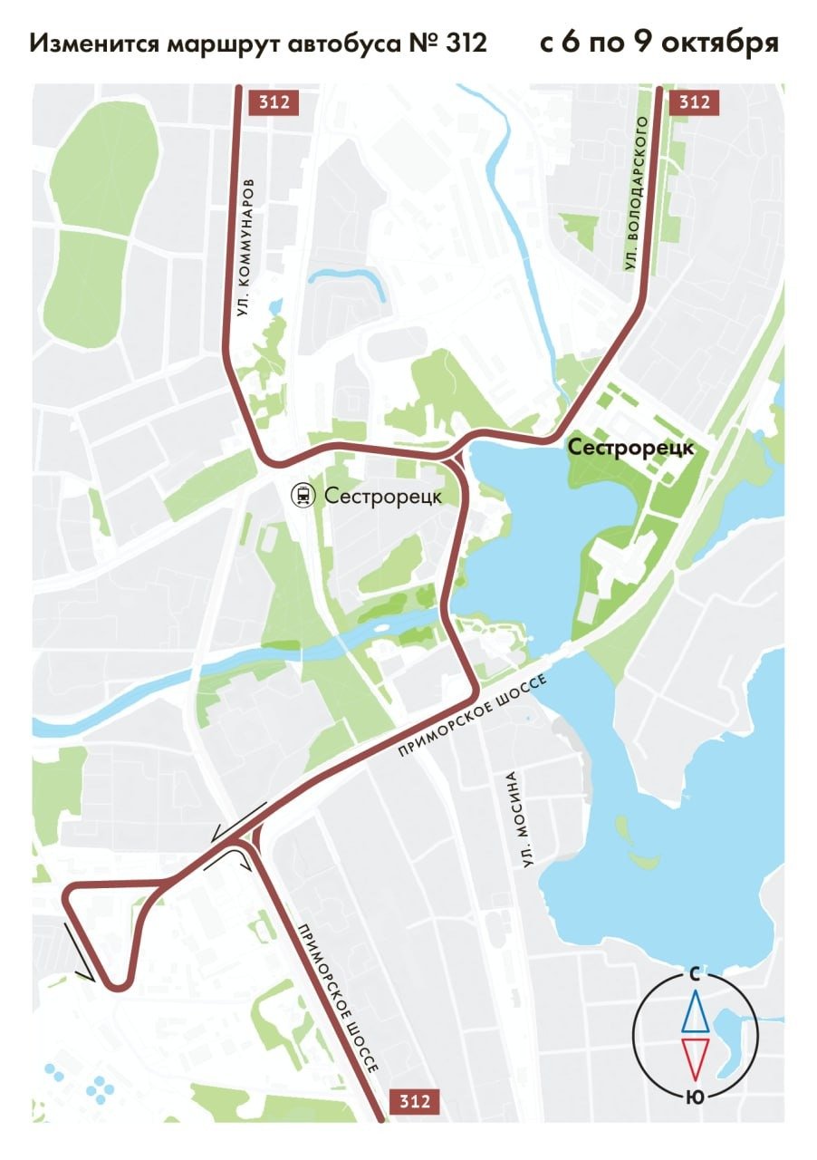 — № 312: от конечной остановки «Городская больница № 40» по действующей трассе до остановки «38-й квартал», далее по Приморскому шоссе, улицам Мосина и Воскова, Дубковскому шоссе, улице Коммунаров и далее до конечной остановки «Сестрорецк, Курортная улица».