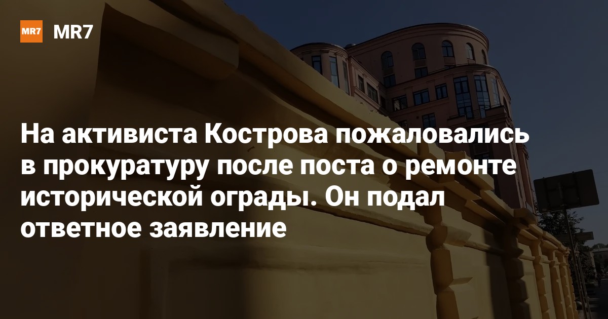 На активиста Центрального района Петербурга Ярослава Кострова пожаловались в прокуратуру после его публикации о плохом качестве ремонта ограды казарм лейб-гвардии Преображенского полка на пересечении улицы Радищева и Виленского переулка. Костров рассказал нам, что подал встречное заявление о ложном доносе.