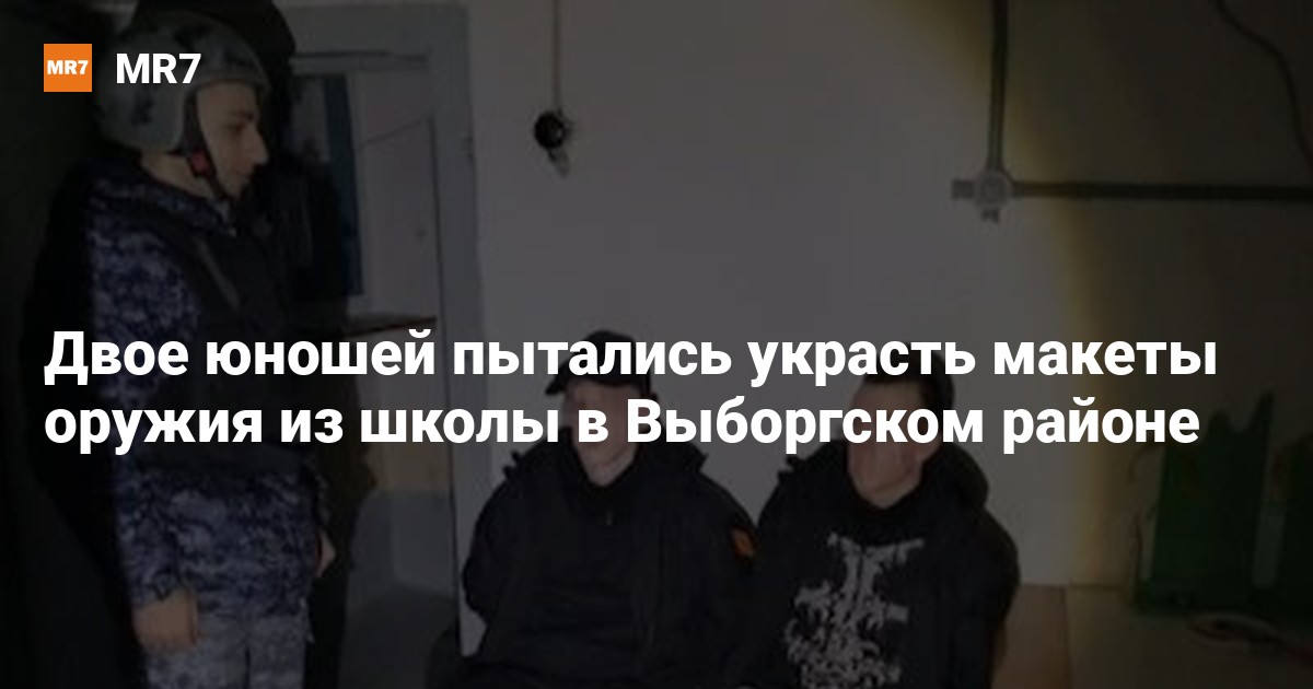 В Выборгском районе Петербурга задержали двух юношей, которые пытались украсть макеты оружия из школы, сообщили в пресс-службе Росгвардии по городу и Ленобласти.
